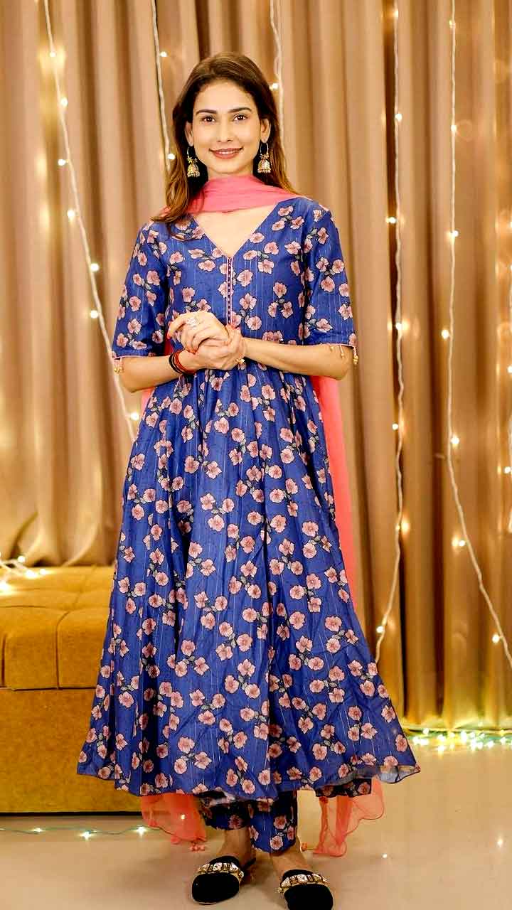 To make a statement on the wedding day, try Aneri’s blue floral suit with a pink dupatta. She opted for this outfit for Diwali 2022.