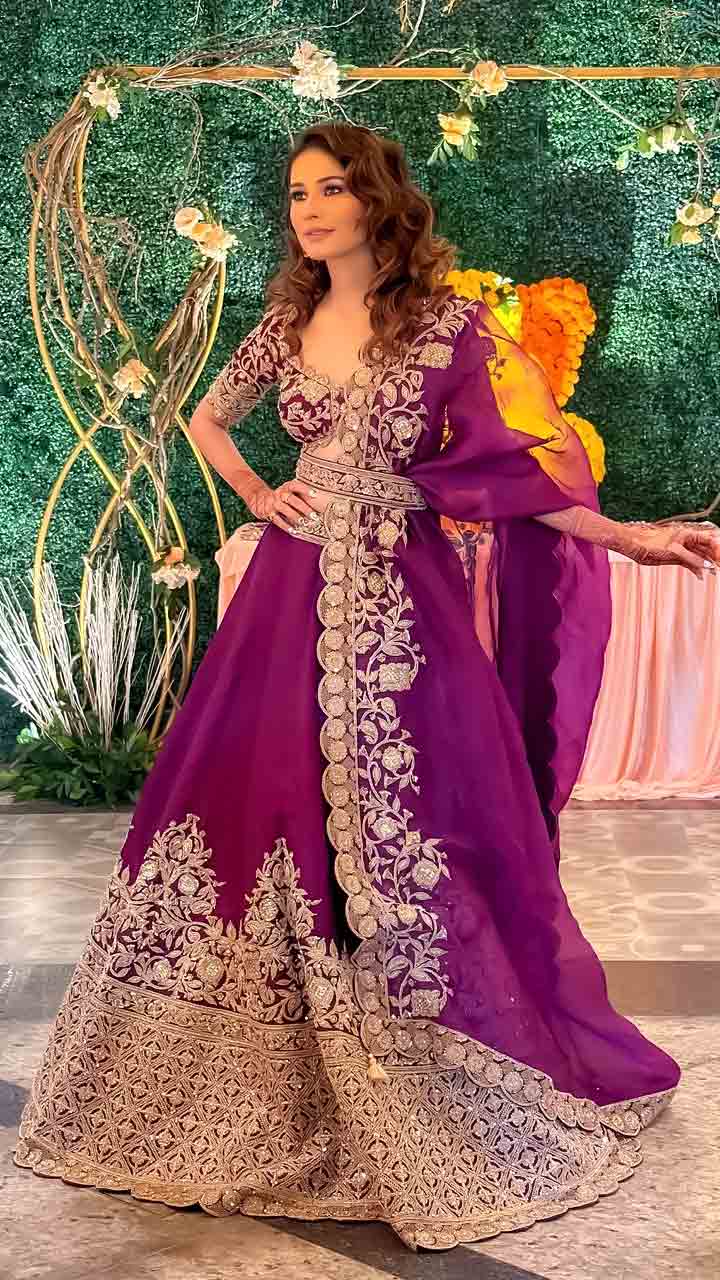Aneri stunned in this violet lehenga with golden thread work around the helm of the skirt, blouse and borders of the dupatta.