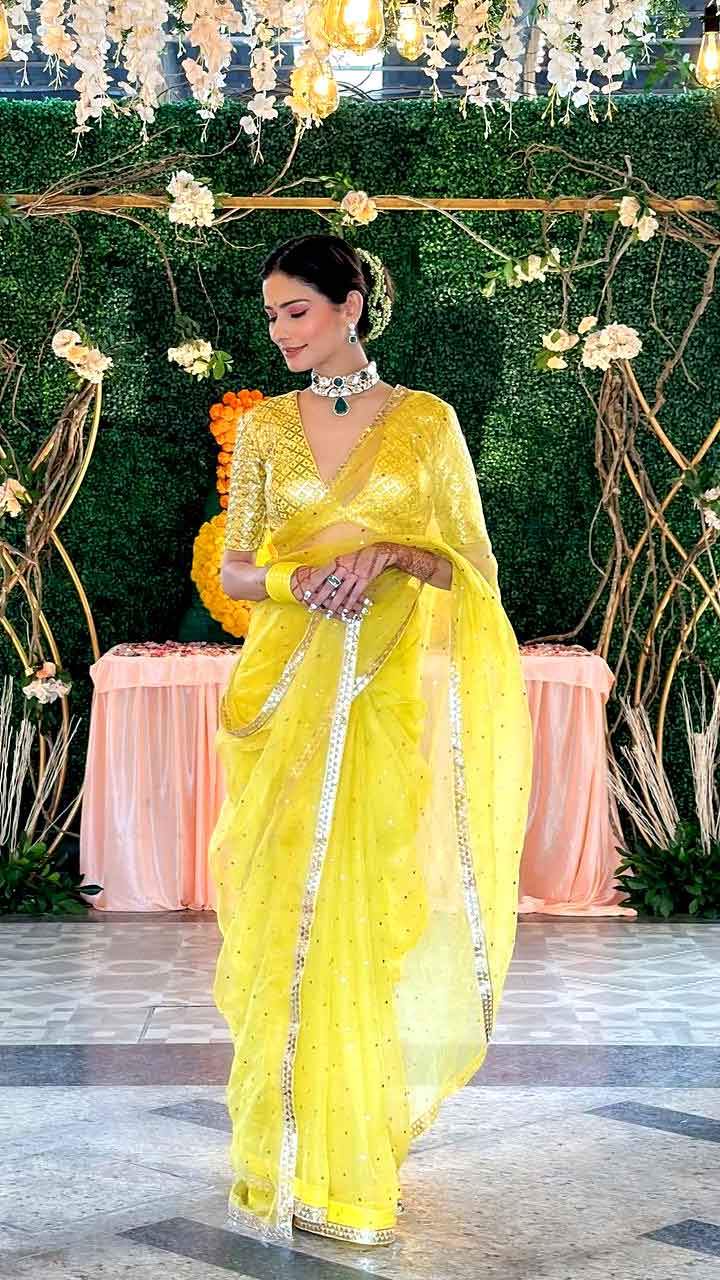 This bright yellow saree of Aneri Vajani is perfect for you to try for sangeet or wedding ceremonies. You can amp up the style quotient with a neat bun and a choker set like the actor.