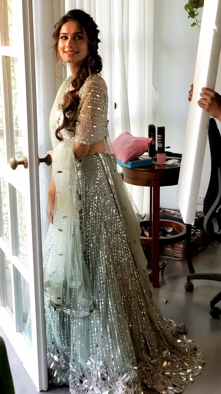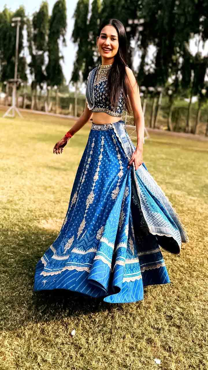 Try this blue lehenga for a sangeet ceremony. The actor left her straight hair open and amplified the style quotient with a choker set.