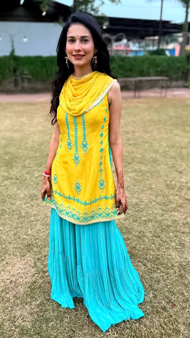 To look chic and casual like Aneri Vajani, try her comfortable sharara set. The actor restricted the jewellery count to earrings.