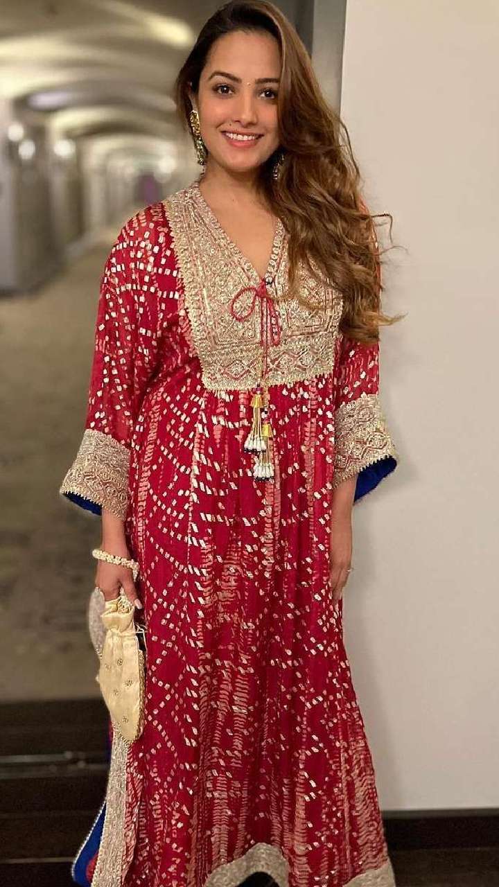 Anita oozed glamour in this red embroidered suit set with intricate golden work. Leave your tresses open to exude elegance.