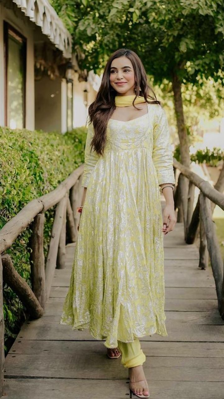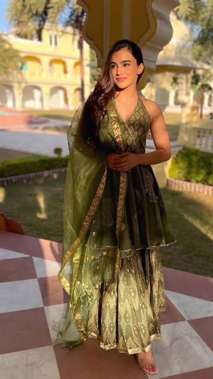 Ankita looked beautiful in a green Anarkali suit with golden and pink details. She elevated her look with a side-parted open hairdo and a bindi.