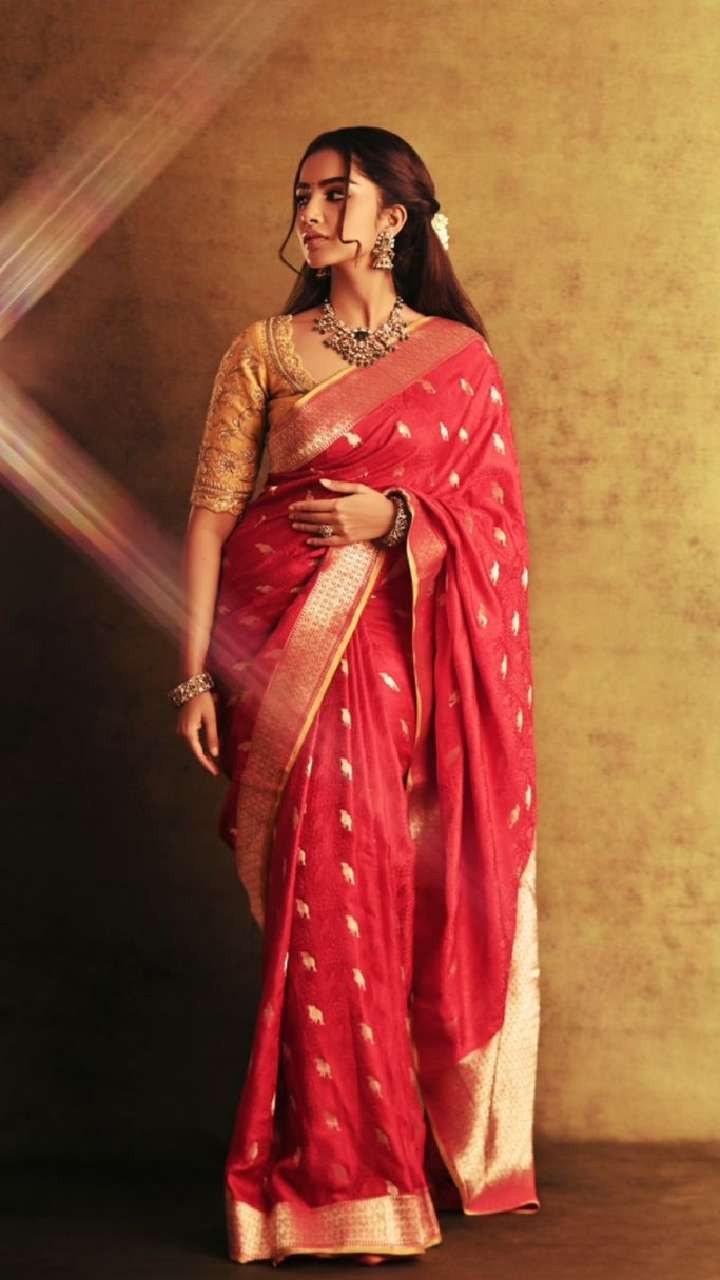 For a conventional look, opt for this red-hued saree and you are all set to exude grace and charm. Amp up the look with an open mane and subtle makeup to slay.