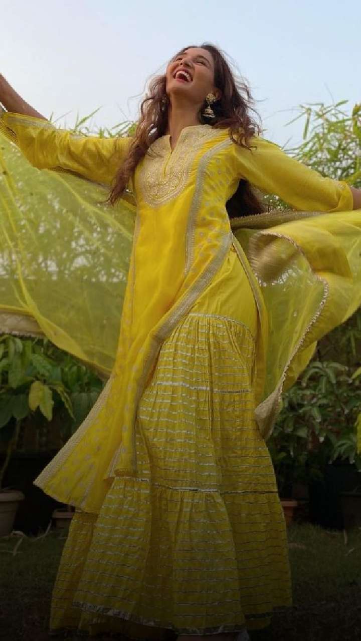 The diva donned this yellow embroidered sharara set with a long kurta and a tiered striped sharara. The outfit is paired with an organza dupatta which accentuates her overall look.