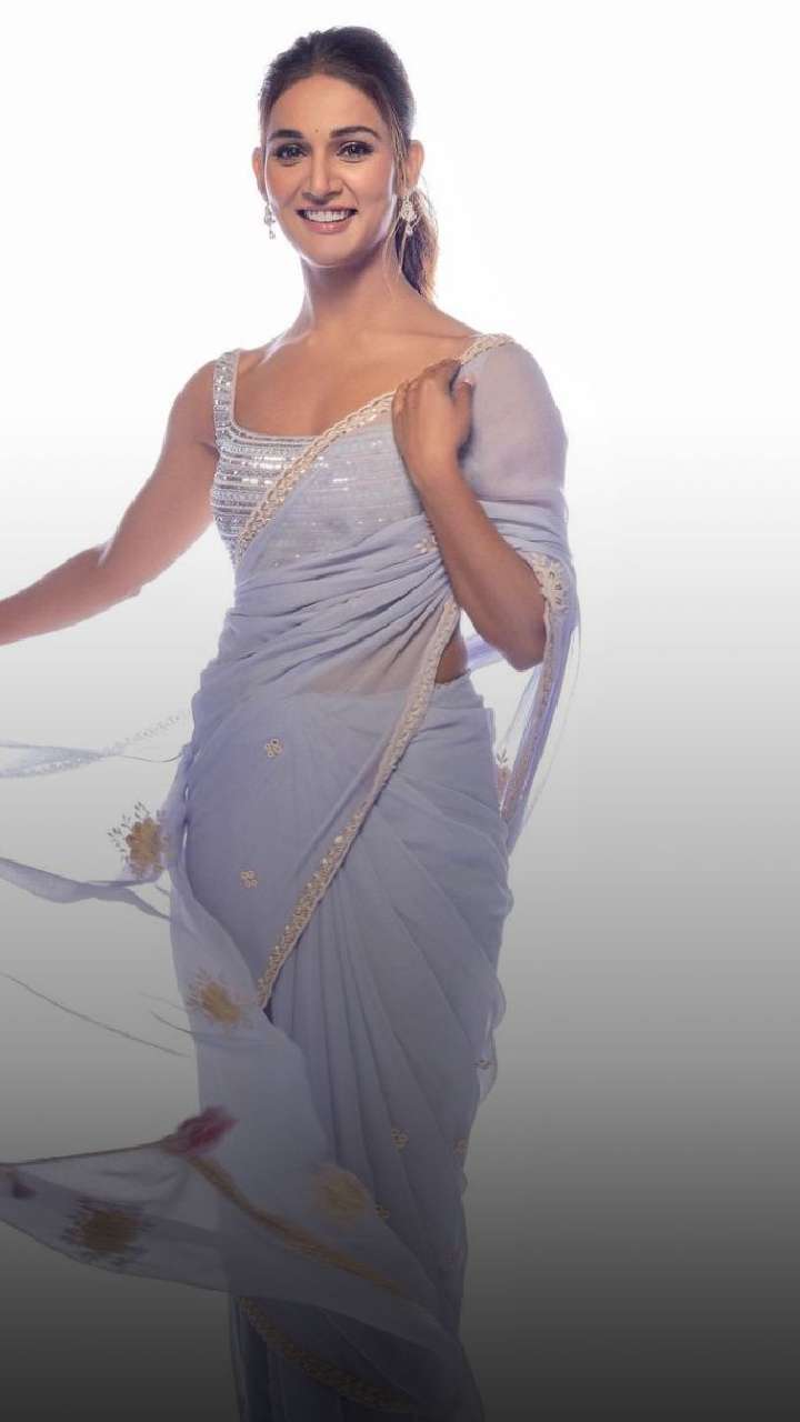 The popular dancer looked radiant in this powder blue saree with rows of sequin flowers on the border for an elegant look. She styled the saree with a sleeveless blouse design.
