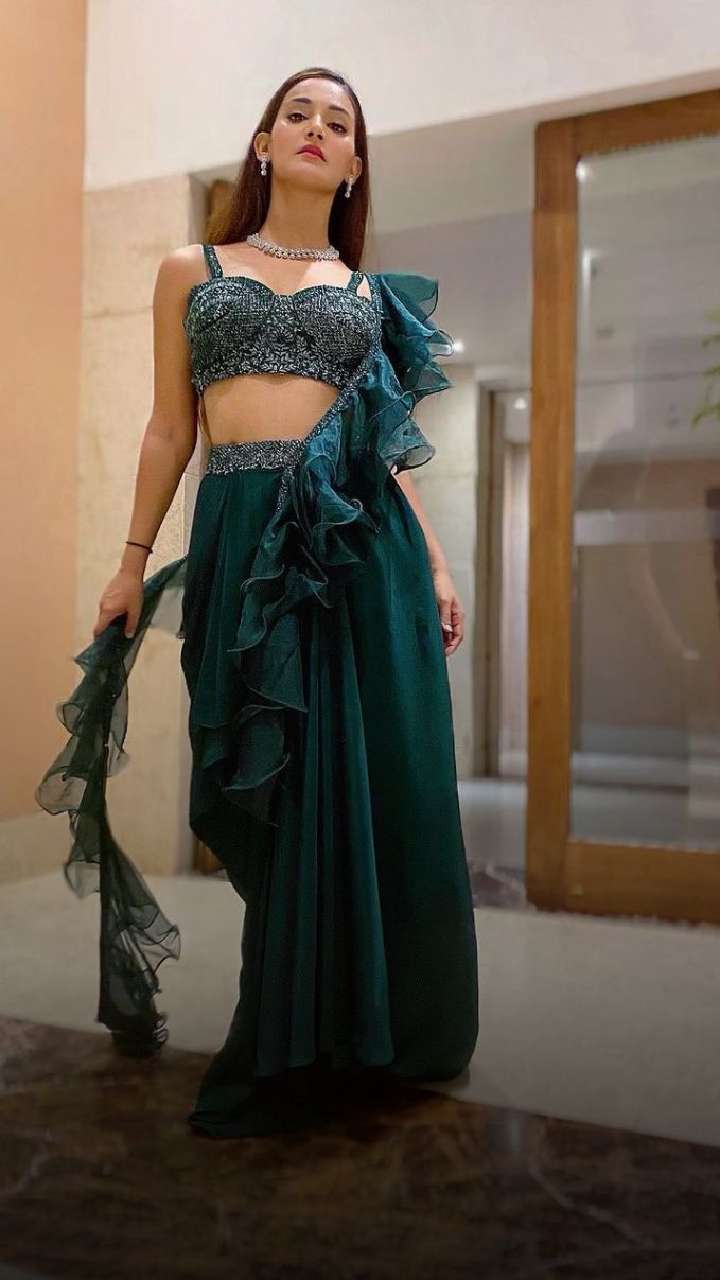 The social media star exuded elegance in this green pleated saree with a spaghetti strap blouse design which is perfect for this wedding season.