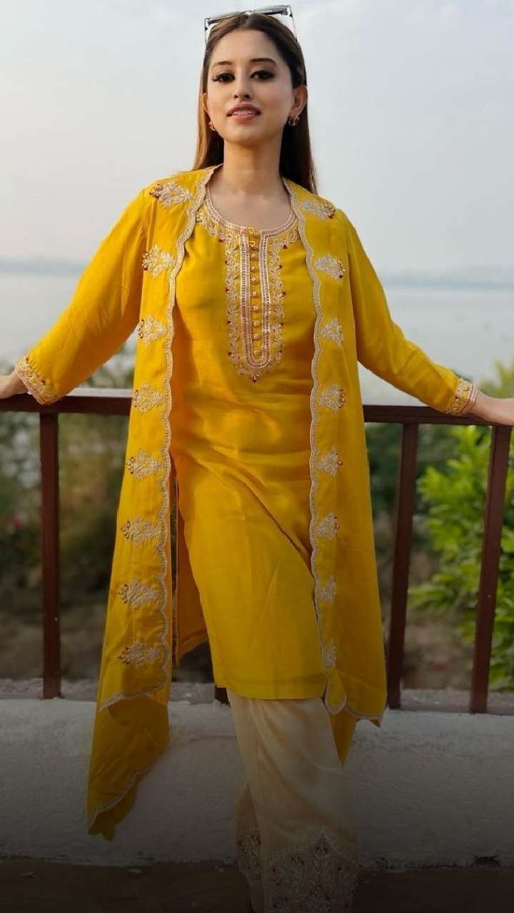 The diva styled this yellow suit set that comes with embroidered detailing along with a palazzo and a matching shrug. You can try this look easily.