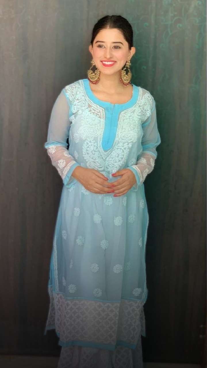 Somi exuded elegance in this blue-coloured chikanakari kurta set that comes with a white palazzo. Complement the look with statement earrings and a beautiful hairdo.