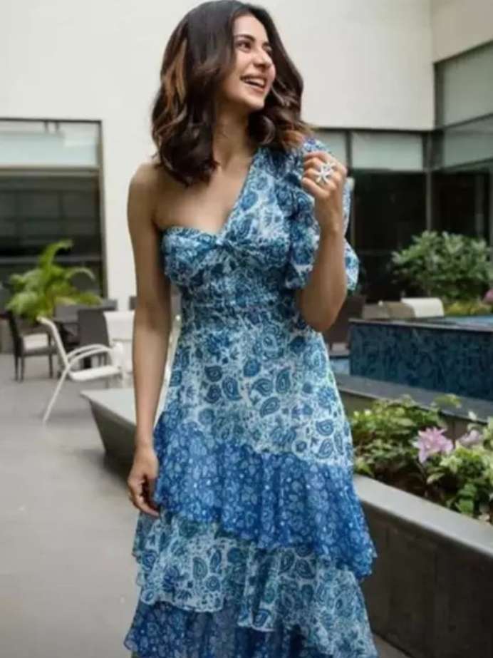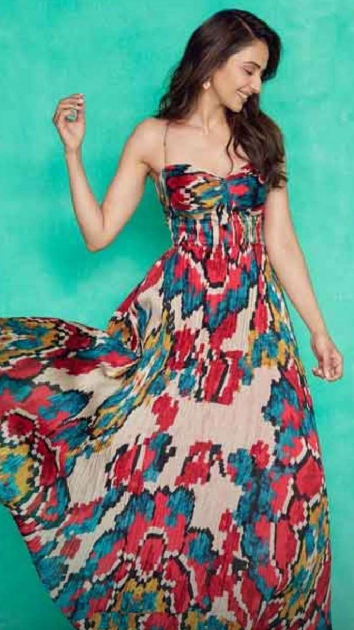 For this look, Rakul Preet Singh wore a strappy sleeve printed maxi dress. She paired her dress with stud earrings. The multi-coloured, flowy dress is ideal for a summer day out.