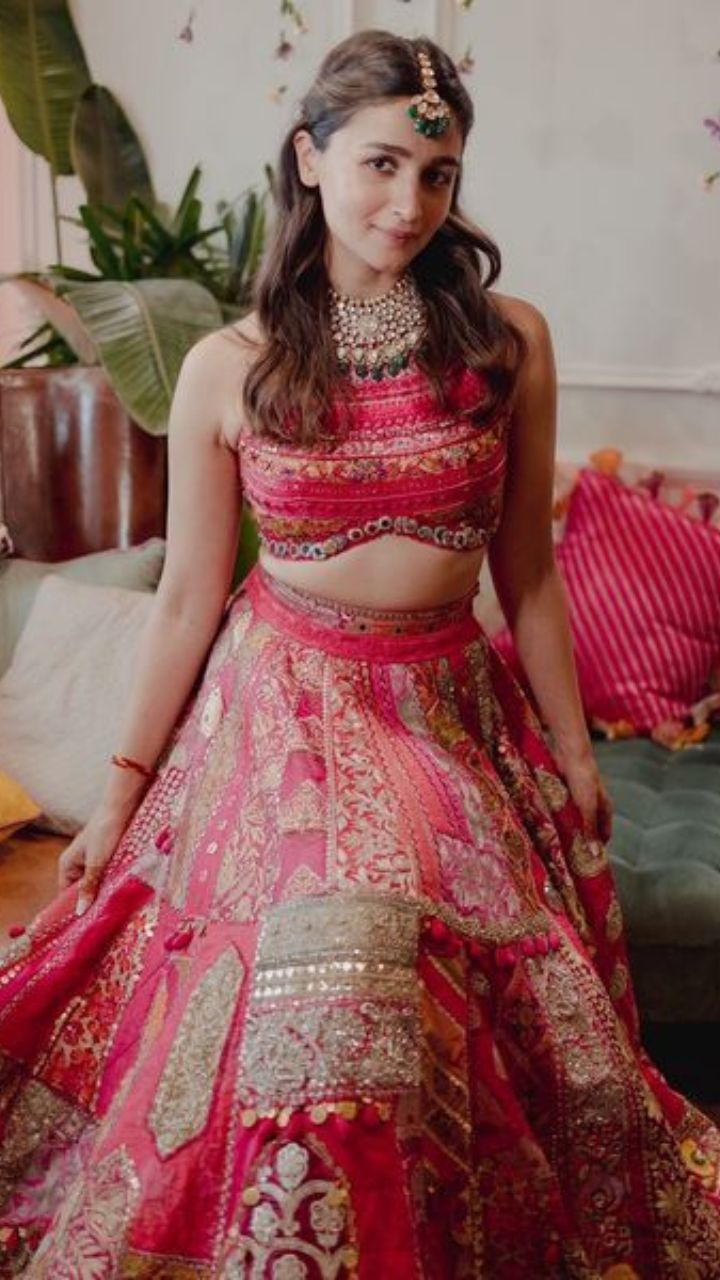 Bhatt’s mehendi ensemble is custom-made by the designer Manish Malhotra and is perfect for newlyweds or a to-be-wed. She paired a halter neck choli with an intricately designed lehenga and accessorised it with a statement necklace and maang tika.