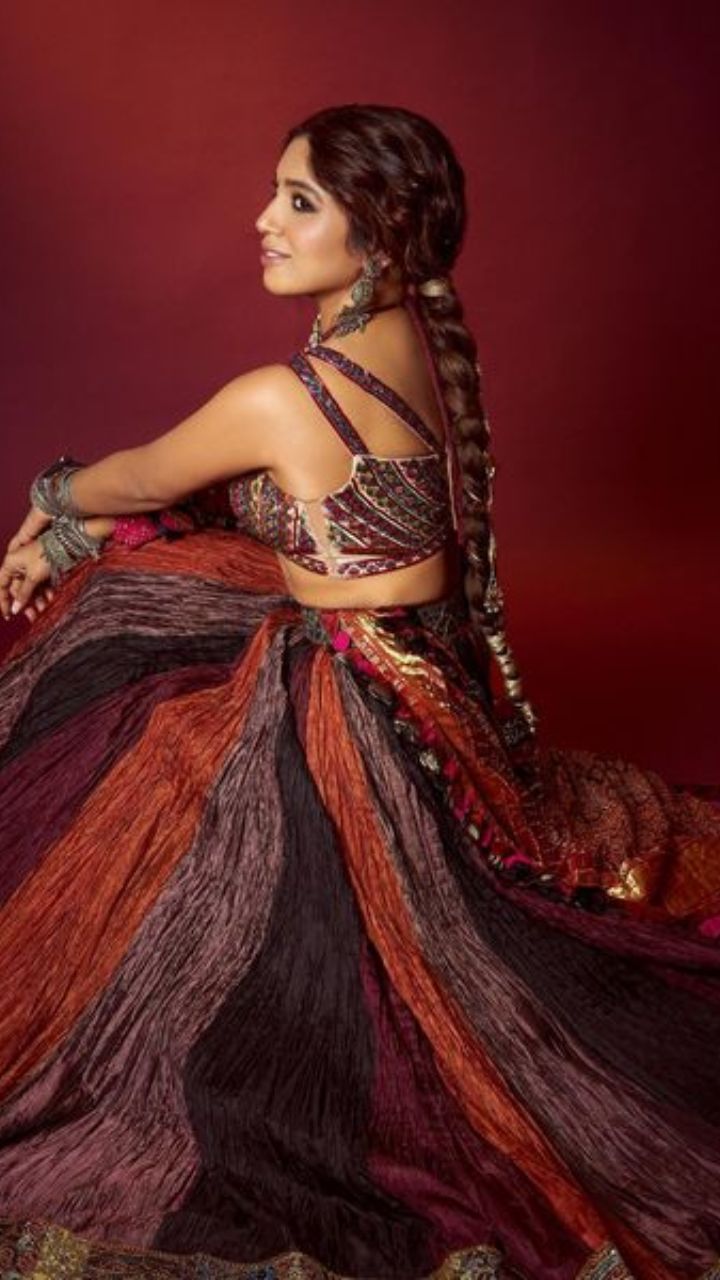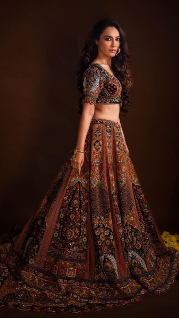 The actor wore a brown and black lehenga designed by Kamal Bhai Saree Sangam. She opted for a long chain nathani and hand harness to elevate her look.