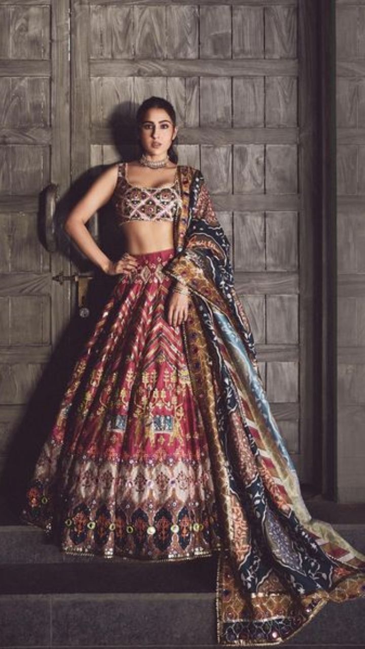 Khan looked graceful in a multicoloured embellished lehenga which is guaranteed to work for brides. She teamed it with a choker necklace, Kundan stone bangle and soft glam makeup.