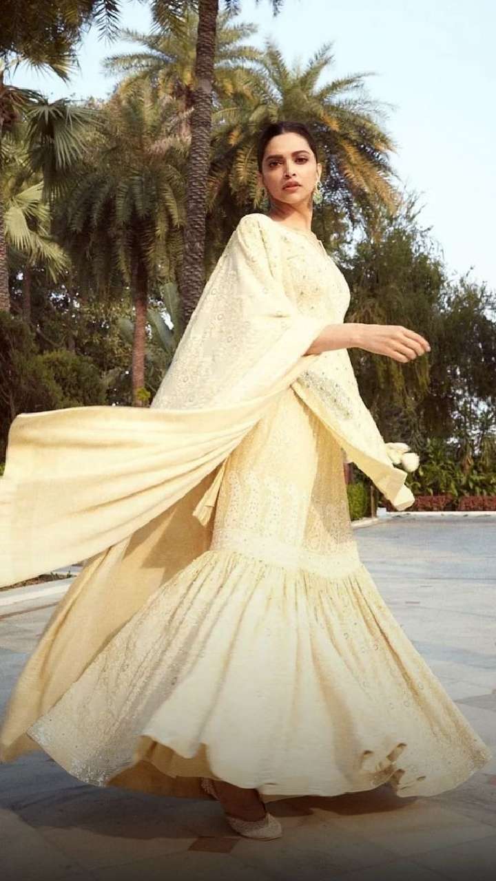 Dipika Padukone dazzled in a pastel-hued yellow three-piece chikankari sharara suit. She accessorised the look with signature chandbali earrings and a sleek hairdo.
