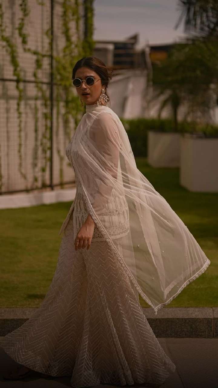 Keerthy Suresh looked a blend of chic and elegant in an ivory fusion sharara suit featuring a sleeveless peplum top and matching wide-leg trousers.