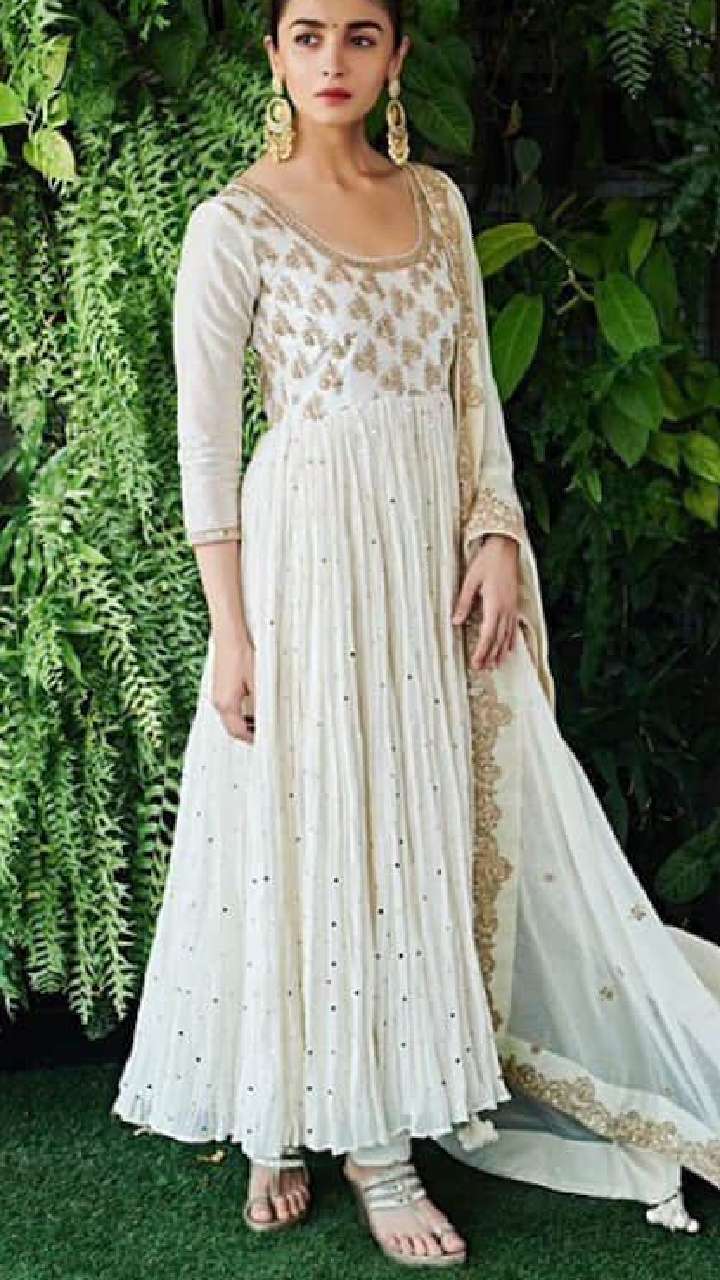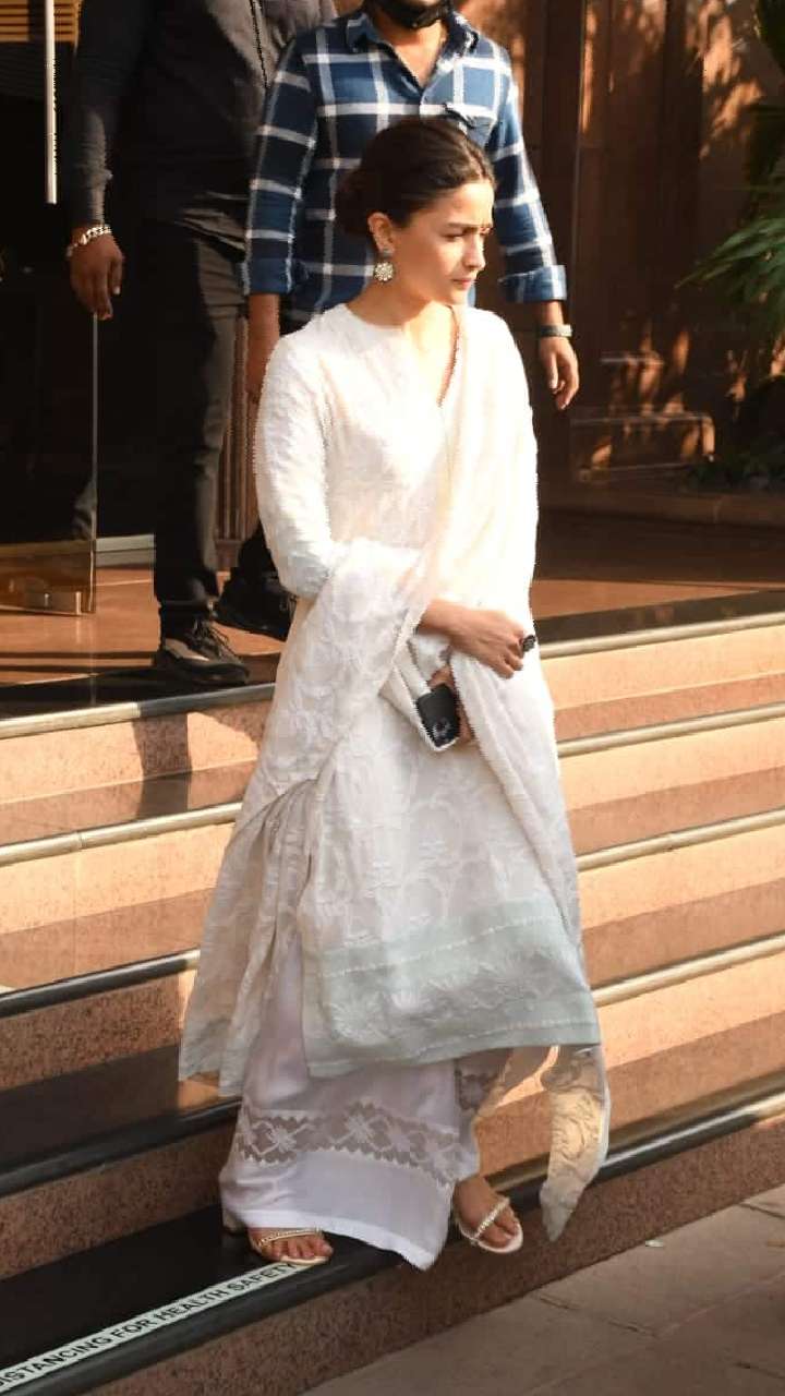 Alia Bhatt stole the spotlight in a classic golden embroidered anarkali suit set. She tied her mane back in a messy bun and accessorised the look with golden statement earrings.
