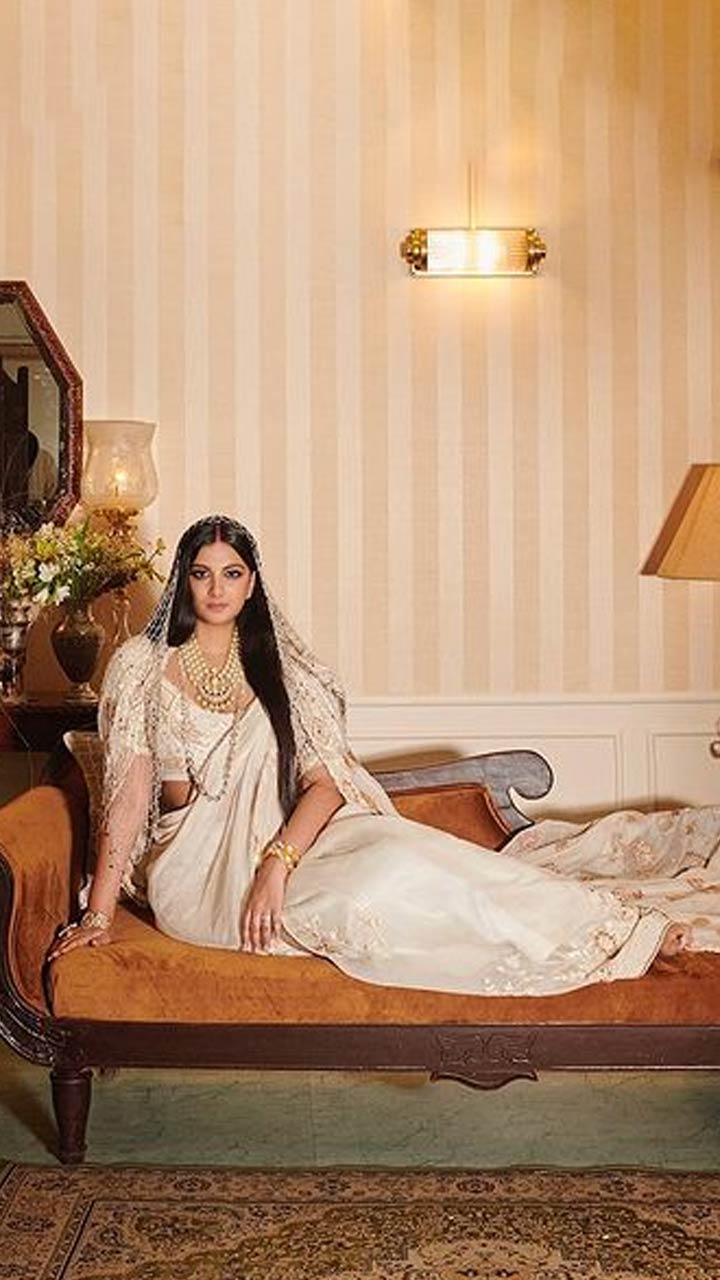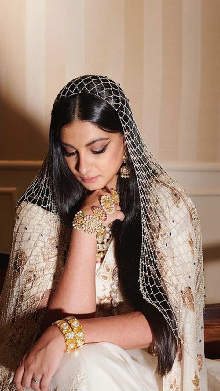Rhea Kapoor wore a classic white saree by Anamika Khanna. She ditched the usual dupatta and opted for a veil crafted with little pearls.