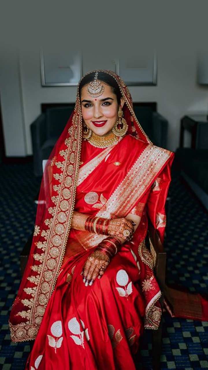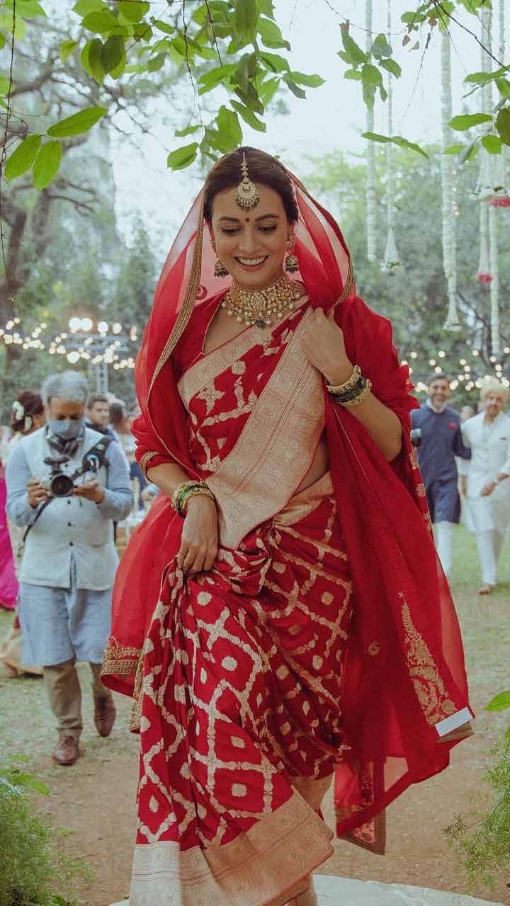 Dia Mirza wore an iconic red Banarasi saree with a thick golden border from Raw Mango and completed her look with a red sheer veil.