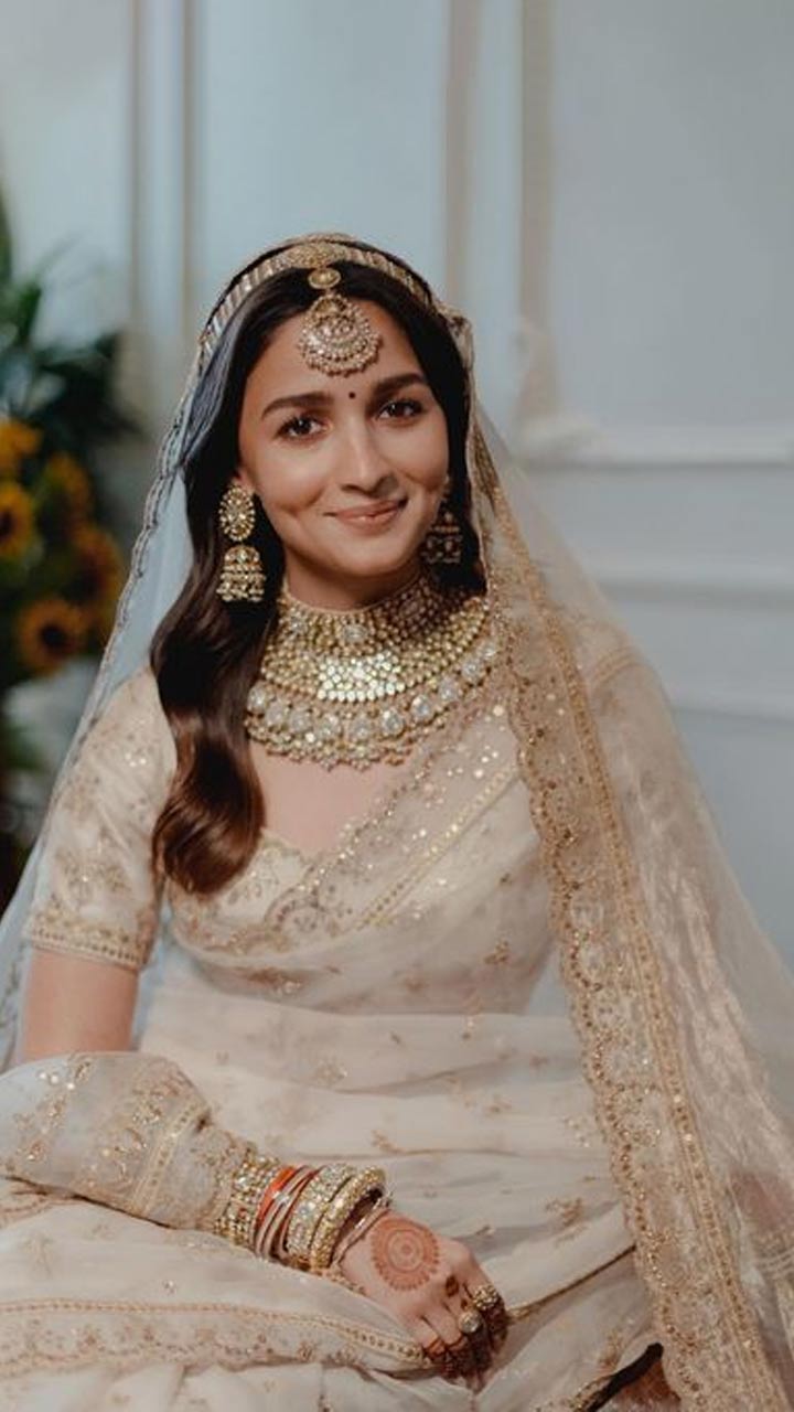 Alia Bhatt was a Sabyasachi bride and she wore a hand dyed ivory organza saree. The saree was paired up with a hand embroidered woven tissue veil.
