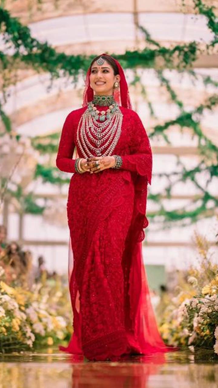 Nayanthara opted for a custom made saree by Monica Shah in a red shade with same coloured embroidery. She completed the look with a sheer red veil.