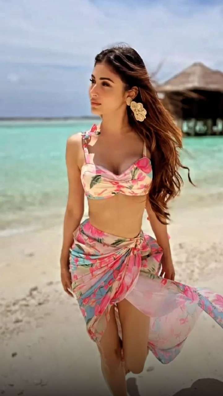 Mouni Roy flaunts her curves as she poses in a bright bikini set in Maldives. It is a strip print with neon and blue. Try this bright bikini to look hot.