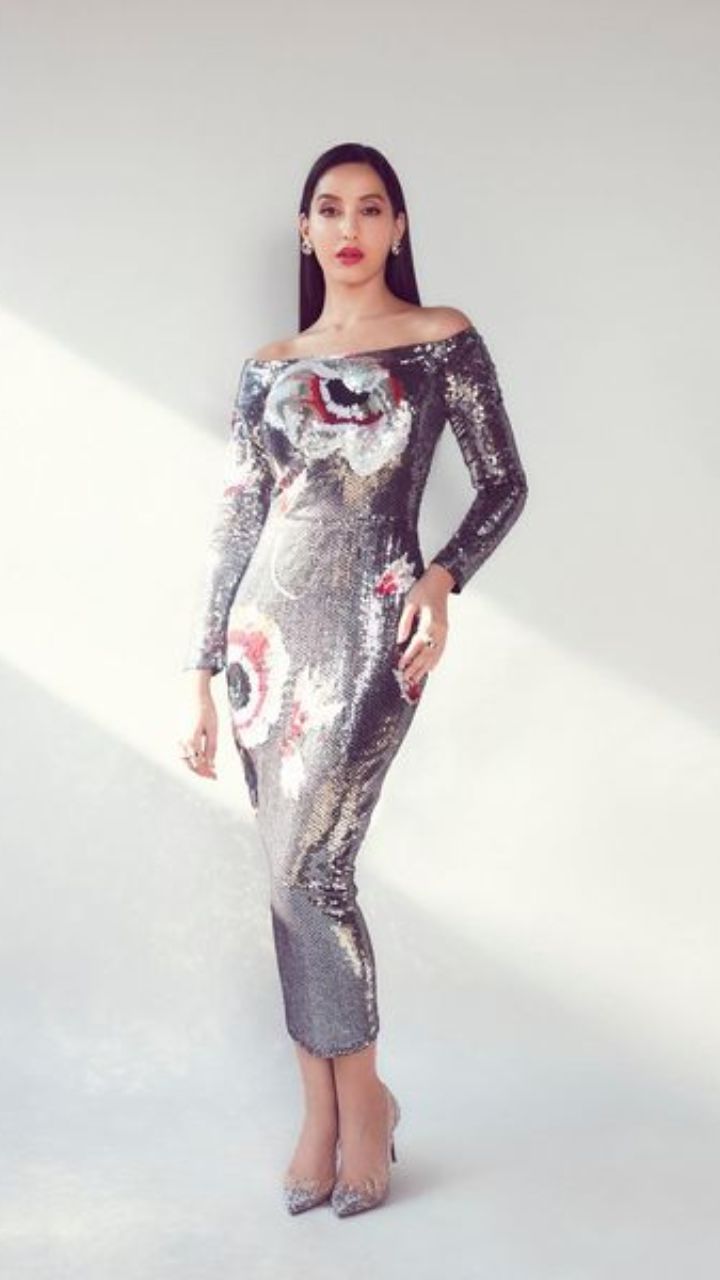 Fatehi donned an off-shoulder silver sequin dress with floral motifs for last Christmas. She completed the look with studs, rings and embellished transparent heels.
