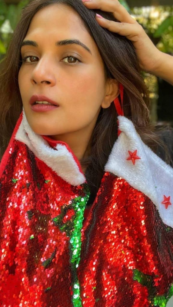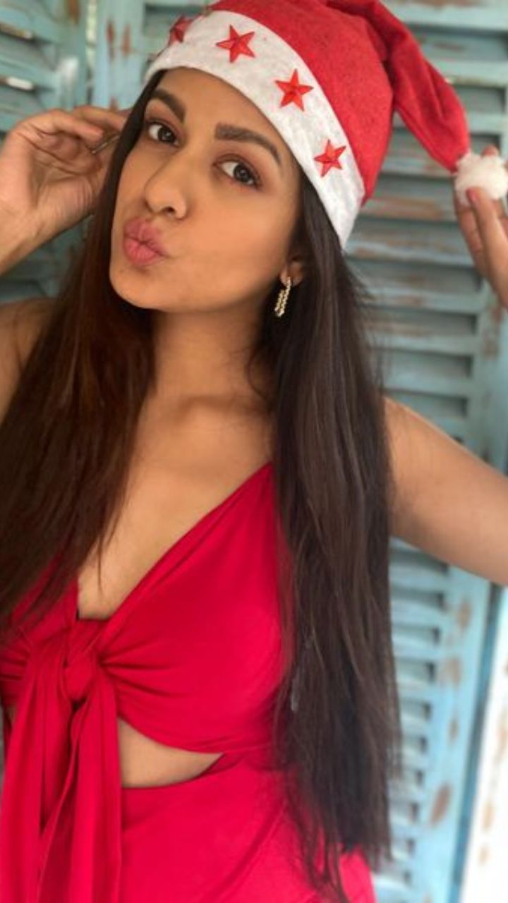 Ishita Dutta donned a pretty cherry-red dress with cutout and front-knot details. She wore a Santa cap and chose soft glam makeup to complete the look.