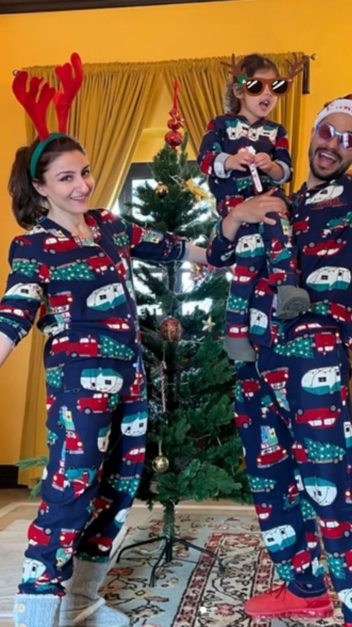 Soha Khan donned cute Christmas PJ’s, twinning with the fam. She was also wearing a reindeer headband to complement the theme and the outfit.