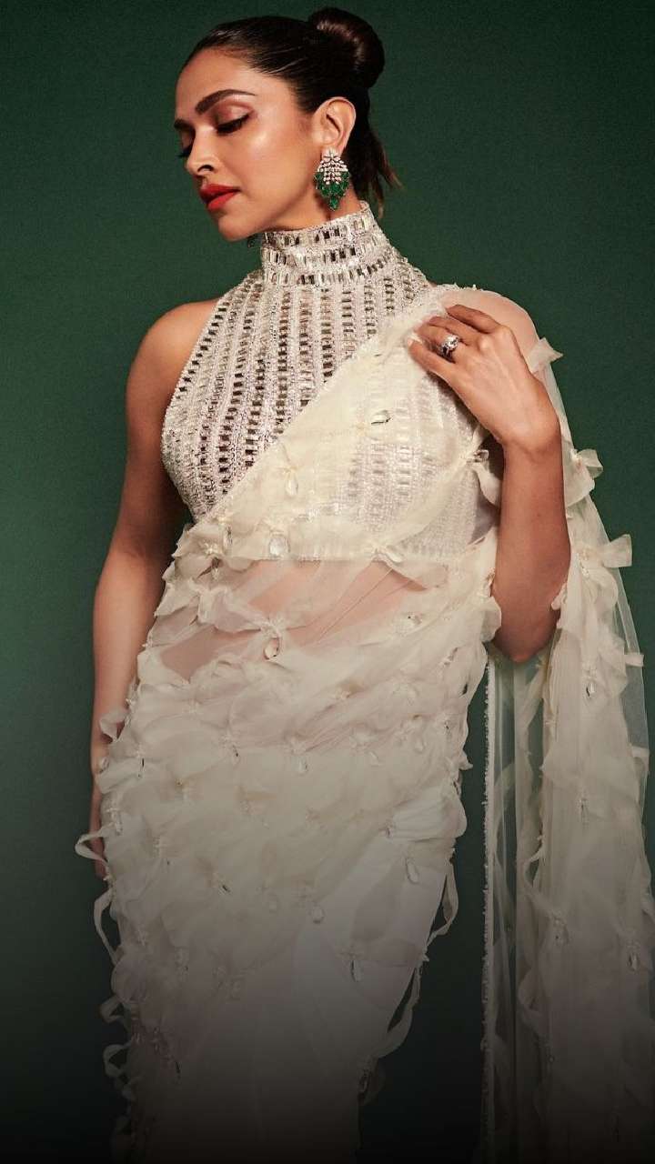 If you have to attend any party, you can opt for this gorgeous off-white sequin saree. Deepika paired it with a strap blouse, adding a bold touch to the overall look.