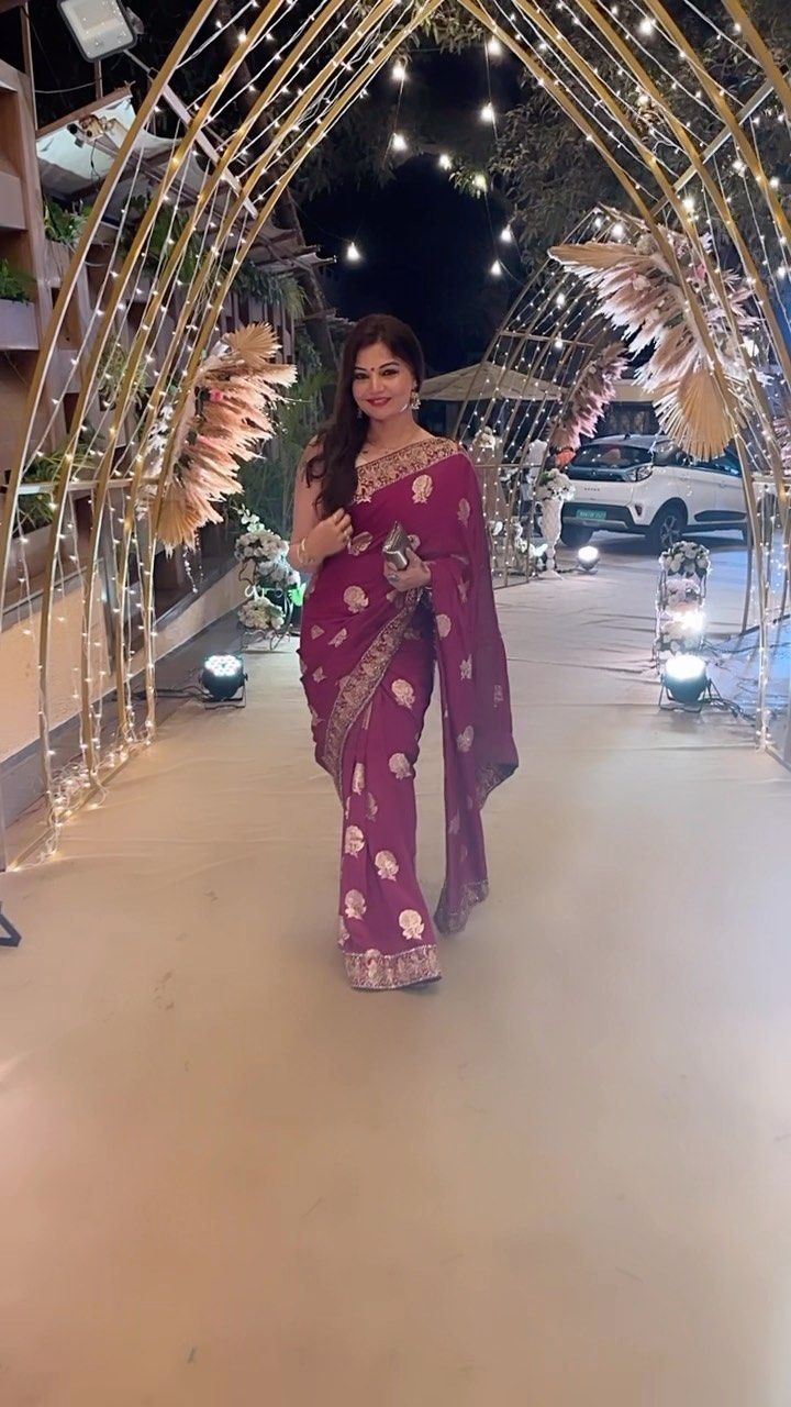 The actor wore a purple saree with intricate golden work. She elevated her look with statement earrings and a bindi.