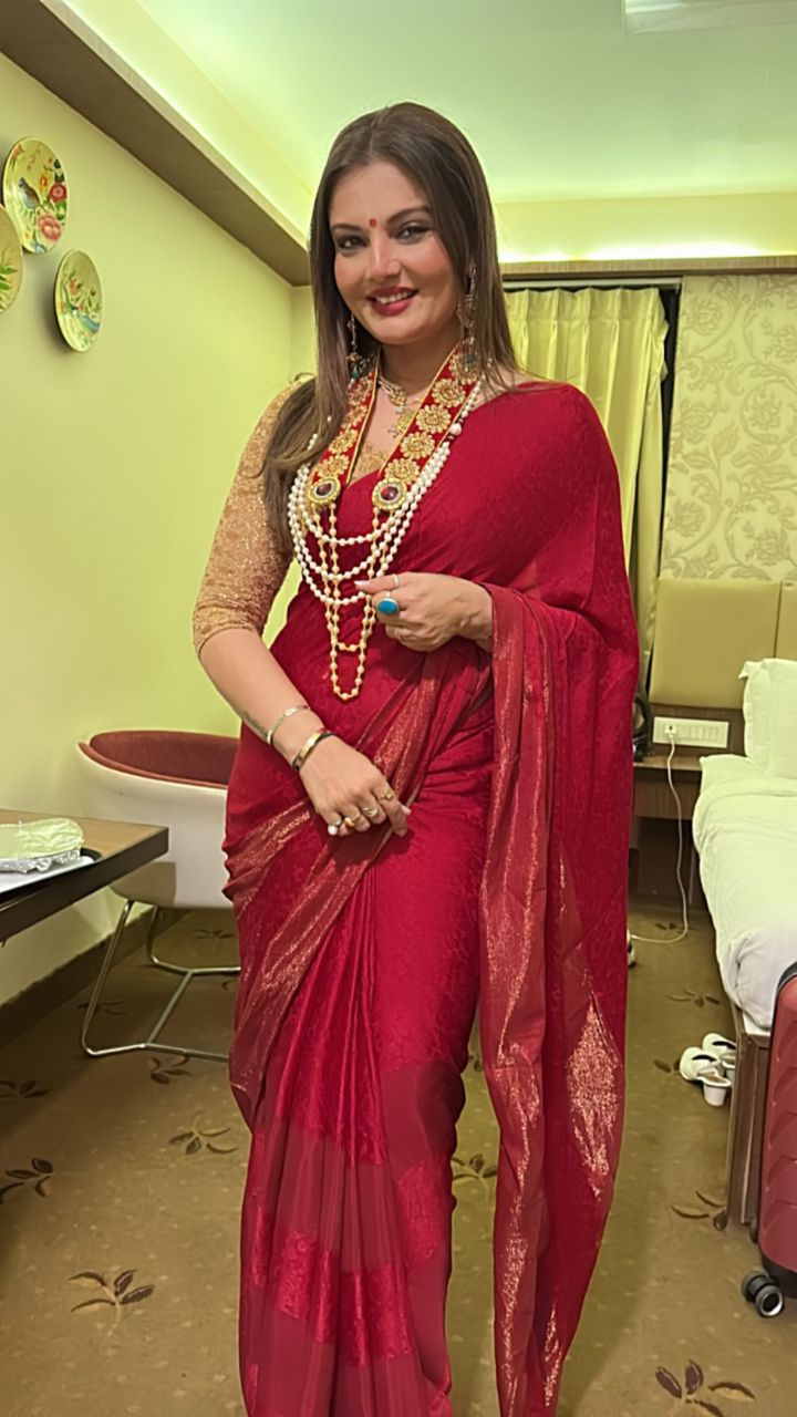 Deepshikha paired a red saree with a quarter-sleeved golden blouse. She completed the look with studded jewellery and a middle-parted open hairdo.