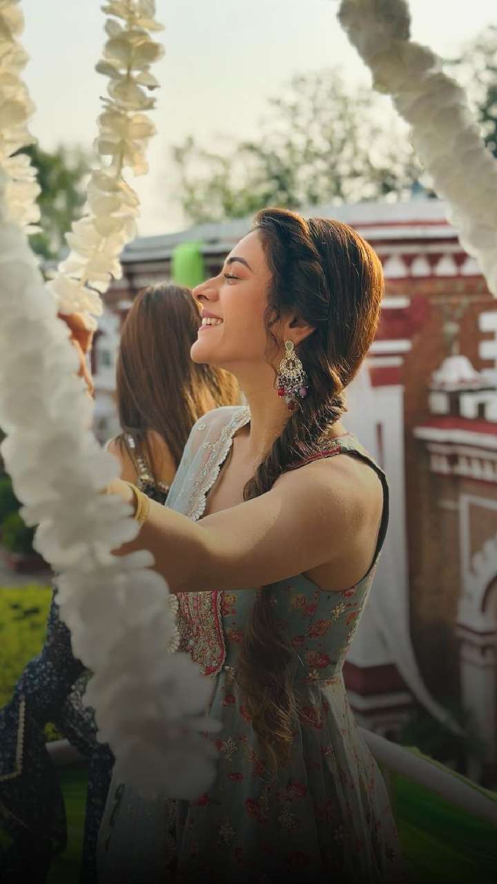 Flaunt your long, luscious hair by opting for a messy braid. It will look great with a gorgeous ethnic look. Take cues from Hiba to steal the show.