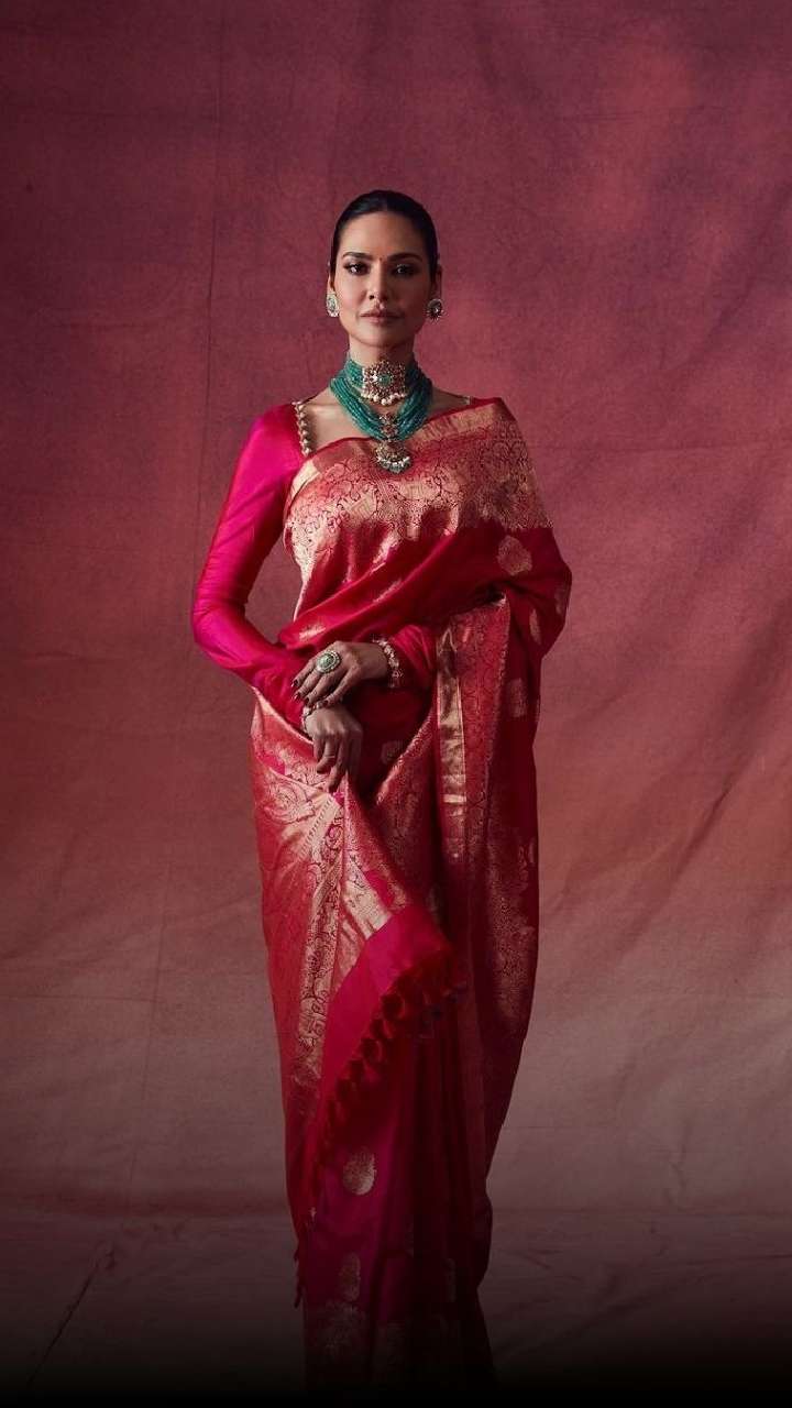 The actress looked glamorous and regal in this pink silk saree. She styled it with a full-sleeved pink blouse. She accessorised the look with a contrast jewellery.