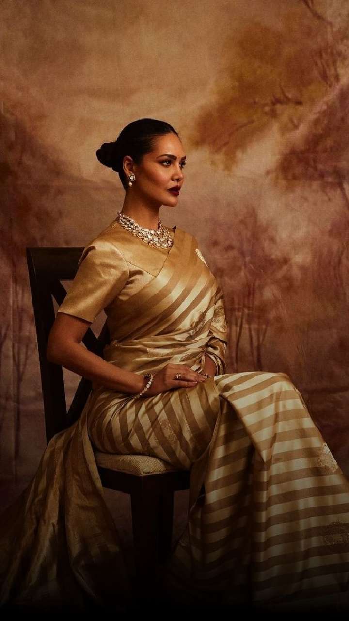 Esha looked gorgeous and simple in this striped saree, which she paired with a half-sleeved blouse. To add an extra charm to her look, she accessorised it with kundan jewellery.