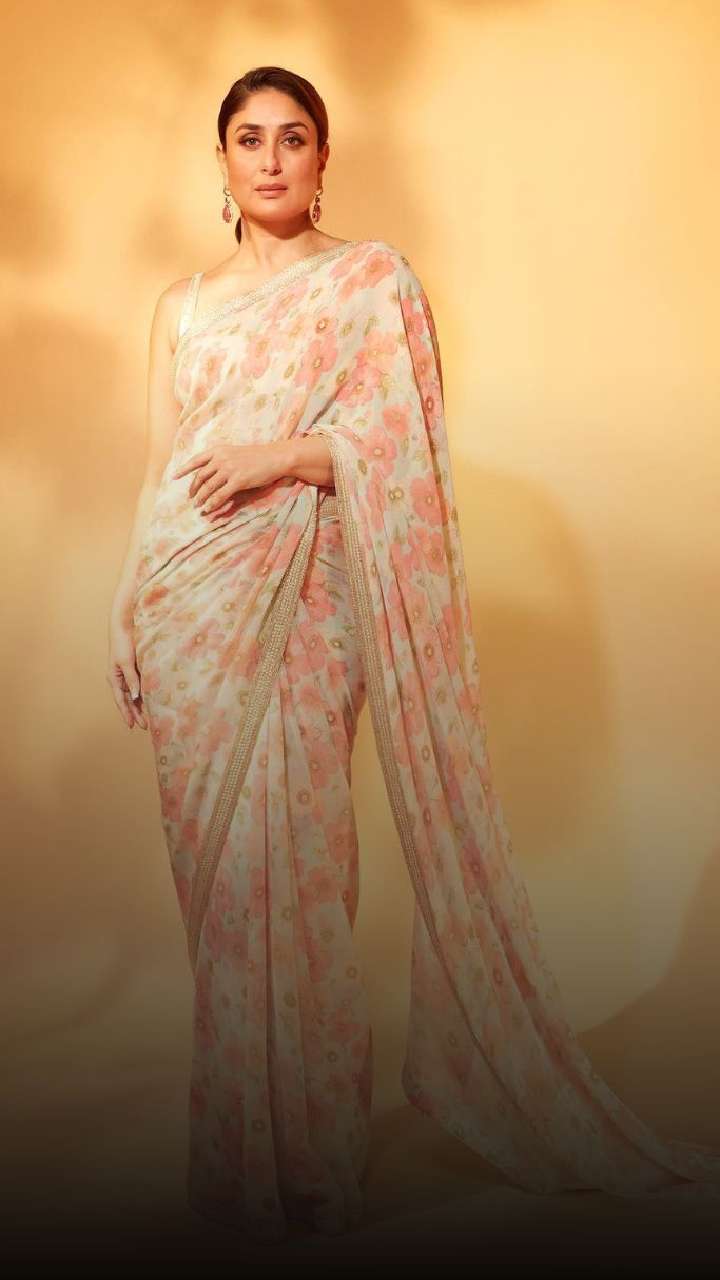 We cannot stop crushing over this beautiful baby pink saree approved by Kareena. The sleek hairdo and soft glam makeup are a work of art.