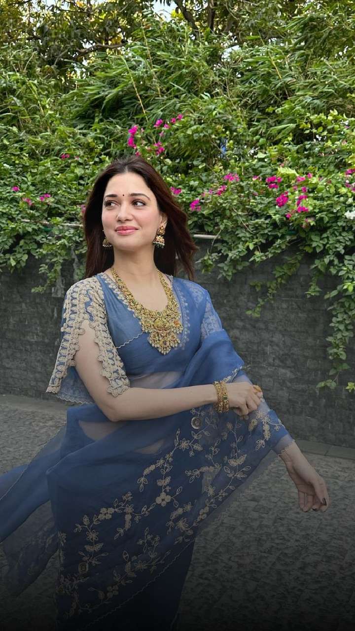 You can never go wrong with this iconic blue-hued saree. The white floral pattern on this is the cherry on top. We love how Tamannaah opted for an open mane to elevate the look.