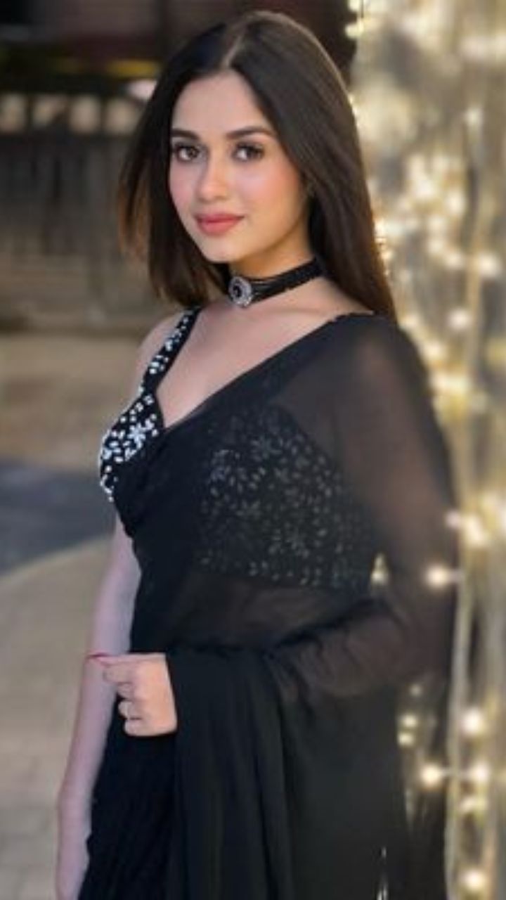 Jannat looked gorgeous wearing a black sheer saree, paired with an embellished sleeveless blouse.