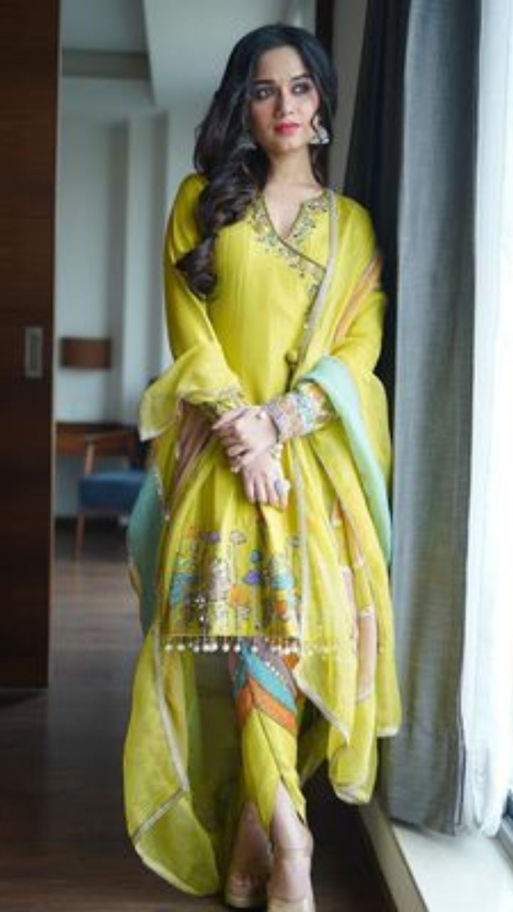 Zubair looked radiant in a yellow dhoti-salwar suit with an angrakha style, featuring a multicoloured design and tassels.