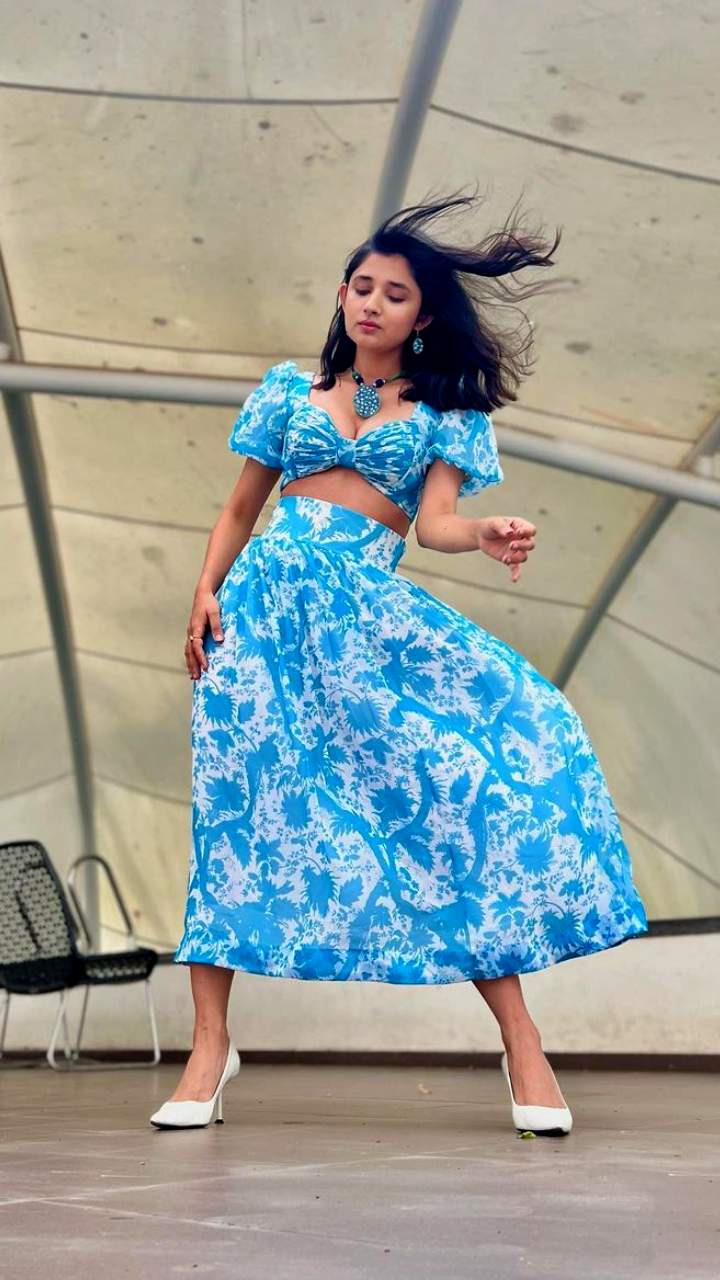 Kanika wore this tie dye sky blue co-ord set with white heels and matching statement blue accessories to go with it.