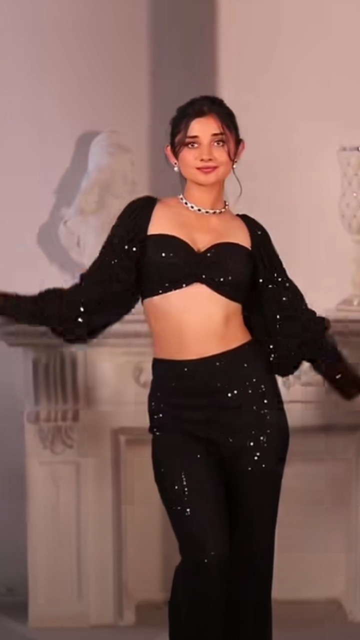 This shimmery outfit of Kanika is giving an edgy look to her style. It has a sweetheart neckline with sequins all over the outfit. She completed her outfit with black heels and statement jewellery set.