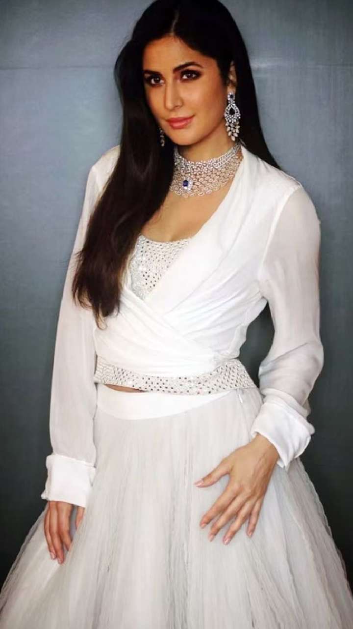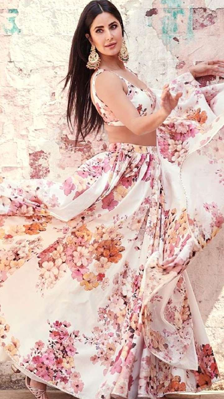 Embrace a unique style with a white floral lehenga with a strappy blouse inspired by katrina kaif. This is perfect for looking trendy at weddings.