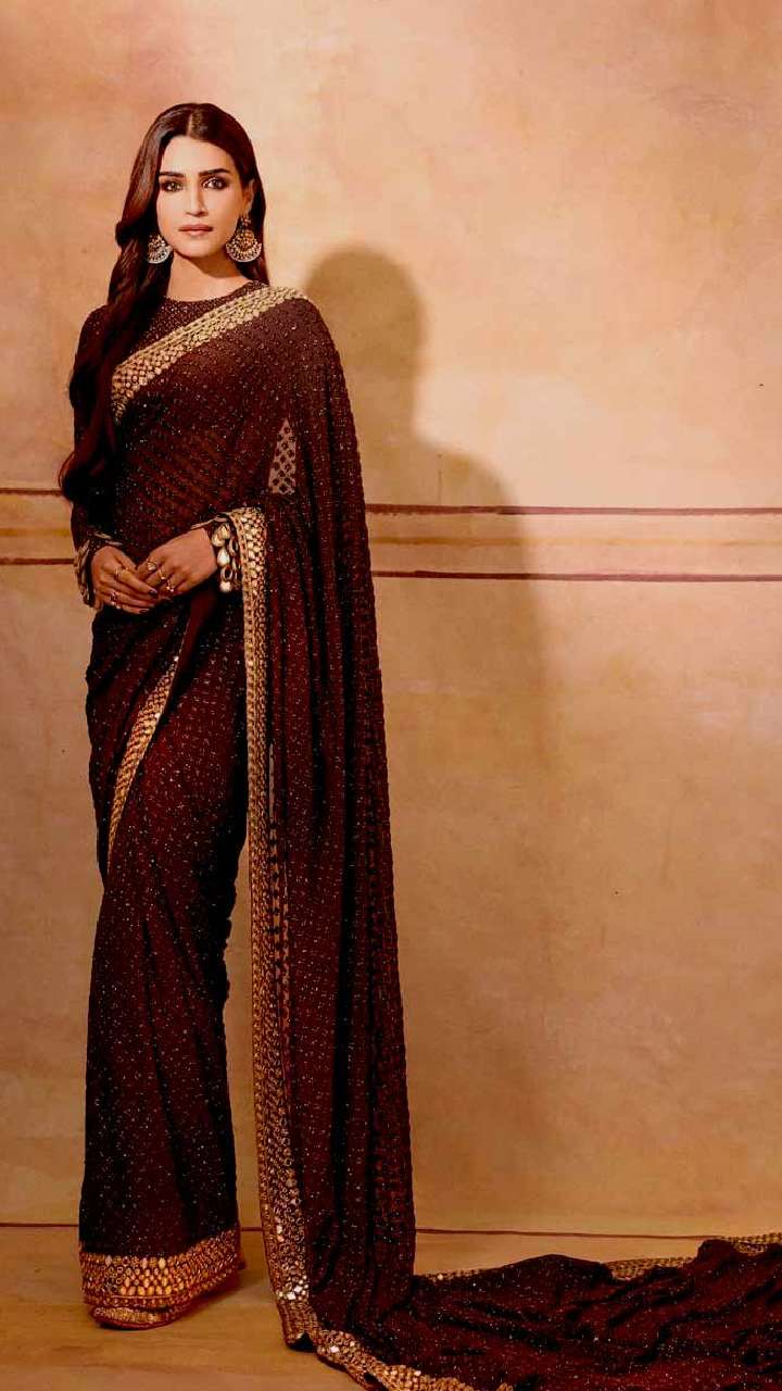Sanon looked ethereal in this customised saree designed by Arpita Mehta. She accessorised it with statement earrings.