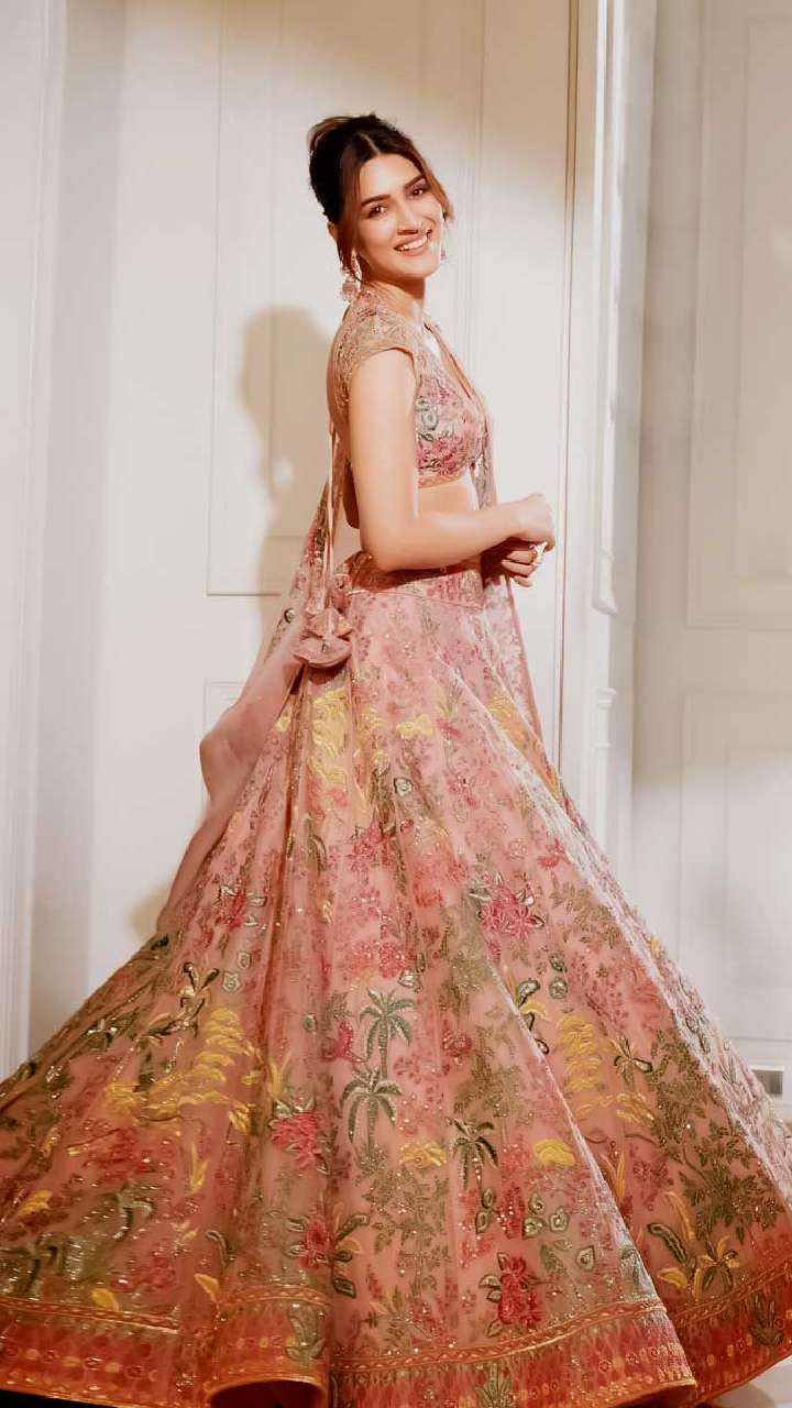 Sanon turned heads around in this floral lehenga designed by Anushree Reddy. The actor elevated the style quotient with jhumkas and a studded ring.