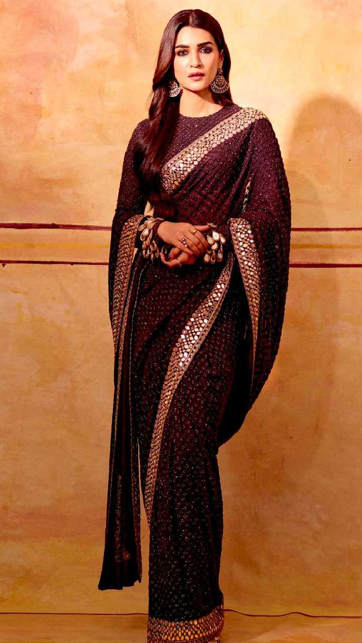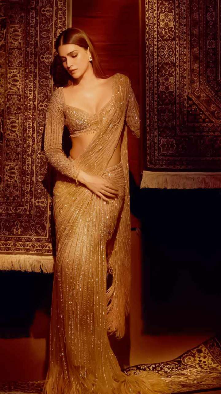 Designed by Falguni Shane Peacock, Sanon opted for this golden glittery saree for an event. She restricted the jewellery count to a minimum and opted for a centre-parted open hairdo.