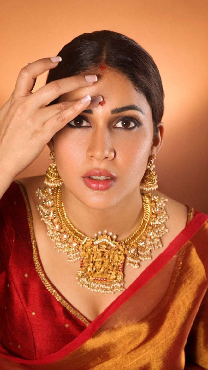 Diva embraced traditional elegance with a touch of bold in a minimally embroidered, deep princess-cut blouse teamed with a classic chanderi silk saree. She elevated the blouse with a sleek bun.