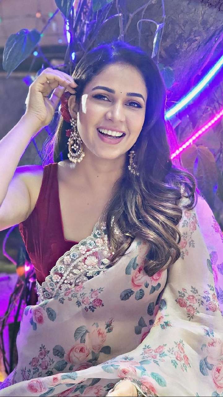 Lavanya styled her chic, scalloped-bordered, floral-printed saree with a contrast maroonish, sleeveless, deep square-neck blouse to exude style and boldness.