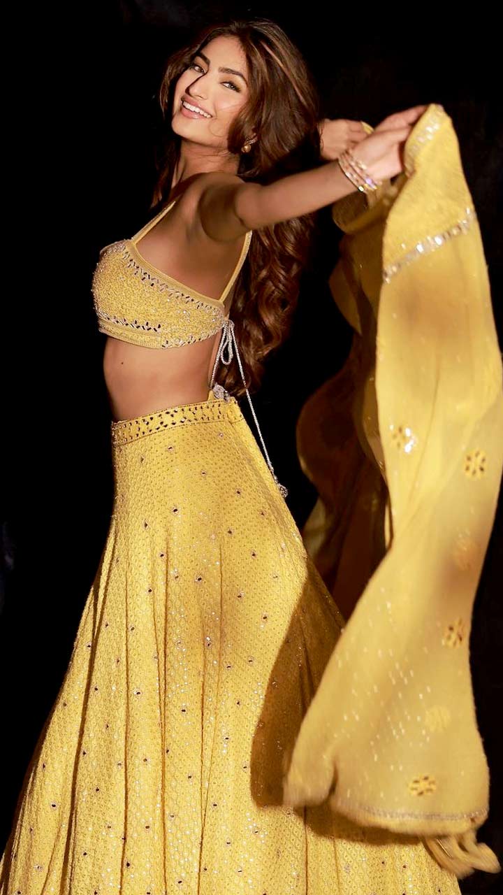 Here the actor was seen in a bright yellow lehenga that has some glitter and mirror work detailing on it.