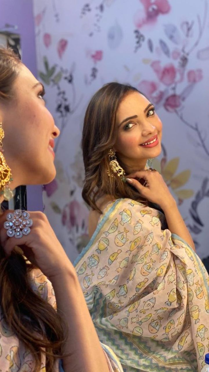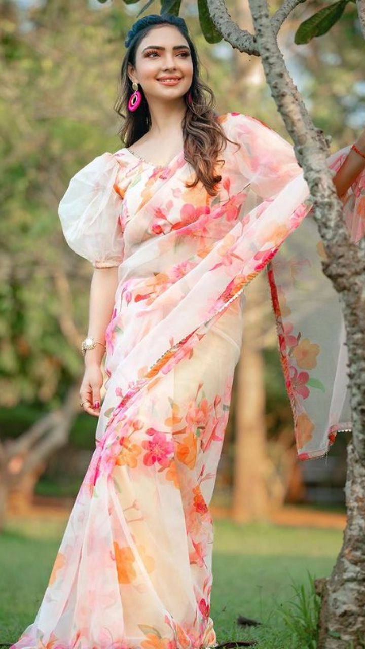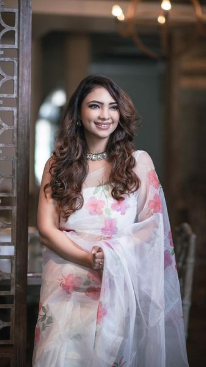 The actor wore a white sheer saree with colourful floral motifs. She completed the look with studded jewellery and full-glam makeup.