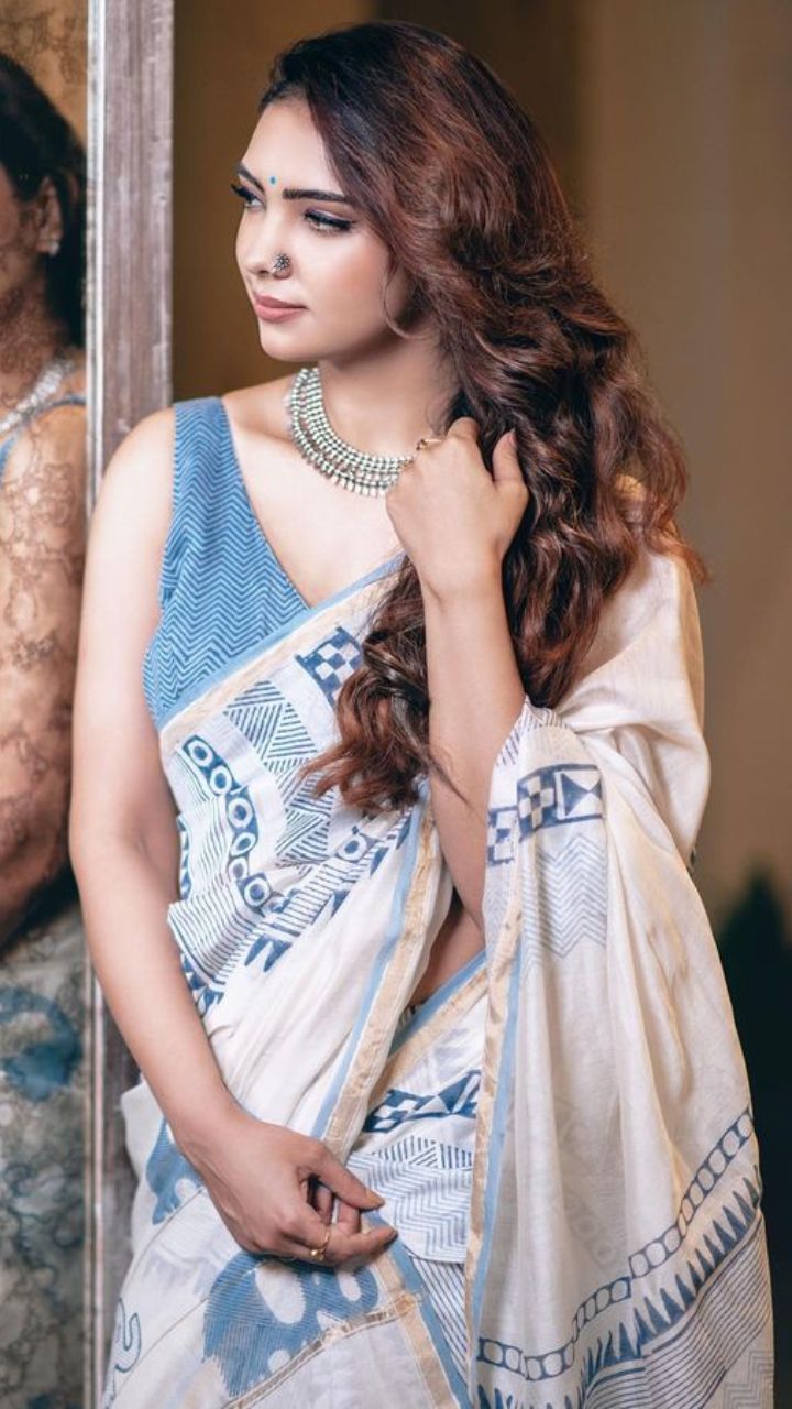 Pooja looked pretty in a beige and blue Bengali saree. She accessorised it with a multistrand necklace, a nose pin and a bindi to elevate the look.