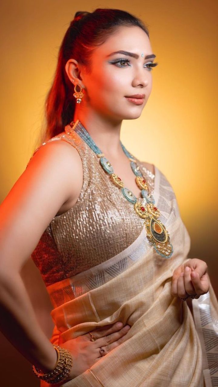 The actor donned a beige saree that had silver work with a golden sequin blouse. She styled her hair in a high ponytail and opted for dramatic eye makeup to seal the look.